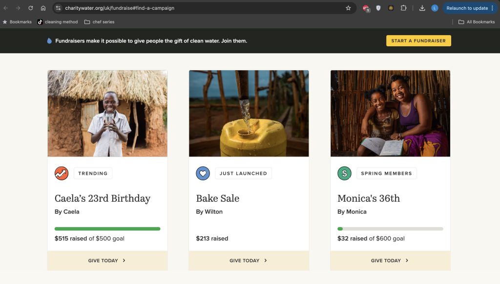 A second way that Non-Profits use the internet to aid their cause is for fundraising. Using platforms such as Kick Starter or Go Fund me, allows for elevated community engagement and opportunity for individuals to become familiar with the cause they are donating to. This helps foster a feeling of community and personal relationship between donation and cause. Combined with social media, charities can post real time updates and information that bolsters transparency and the feeling of donor involvement. All of which are key for Non-Profits receiving continued support. An example of this would be the Charity : Water. Water has an option on their website that allows members to create a personalised Crowd Fund with an individual goal or message. This re-enforces the feeling of community, direct involvement, and seeing direct impact of a donation.