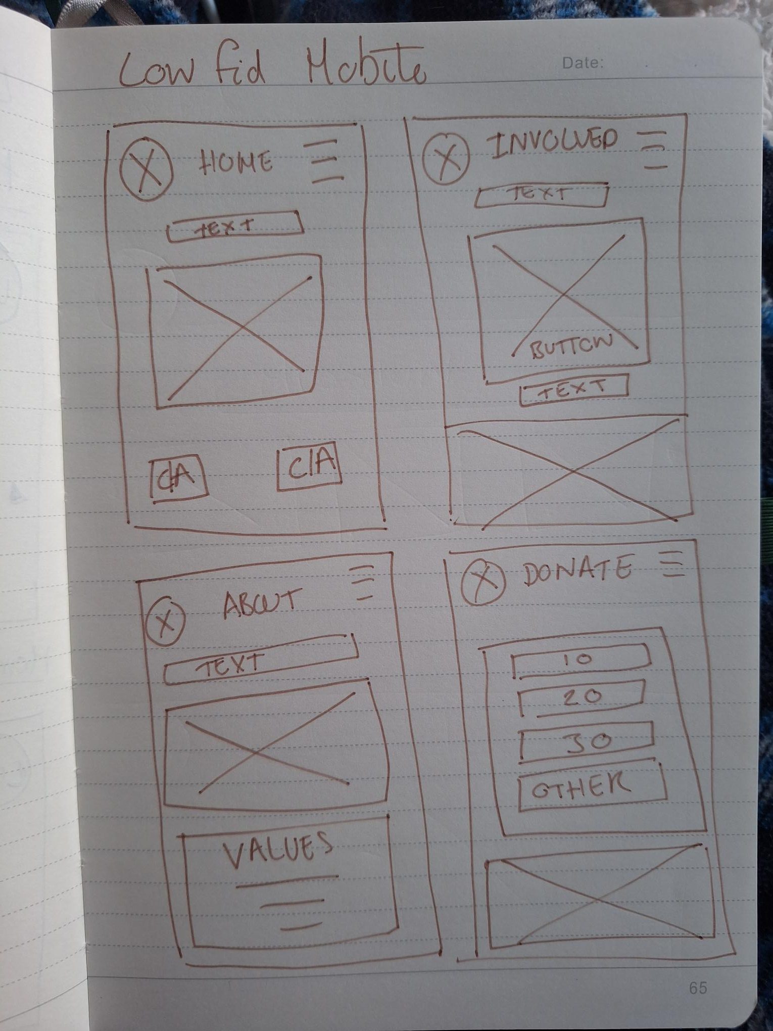 I concentrated on the structure of the About Us page, I wanted to make it clear, legible and concise. I logically divided into sections (About Us, History, Values, and Testimonial). This makes the content scannable and easy to navigate. As a visitor to the page – I want the reader to presented with the important information – not have to look for it. Again, I focused on CTA buttons and placing them strategically along side information that may encourage people to donate.