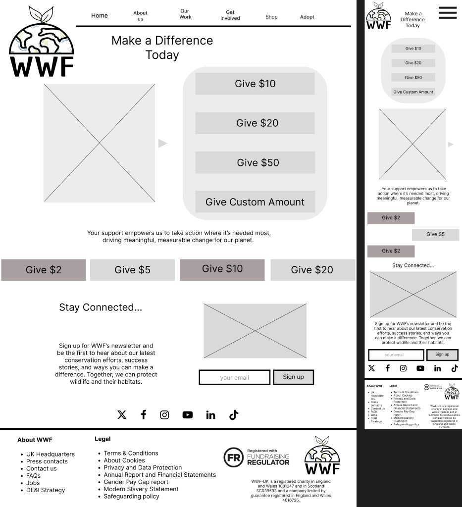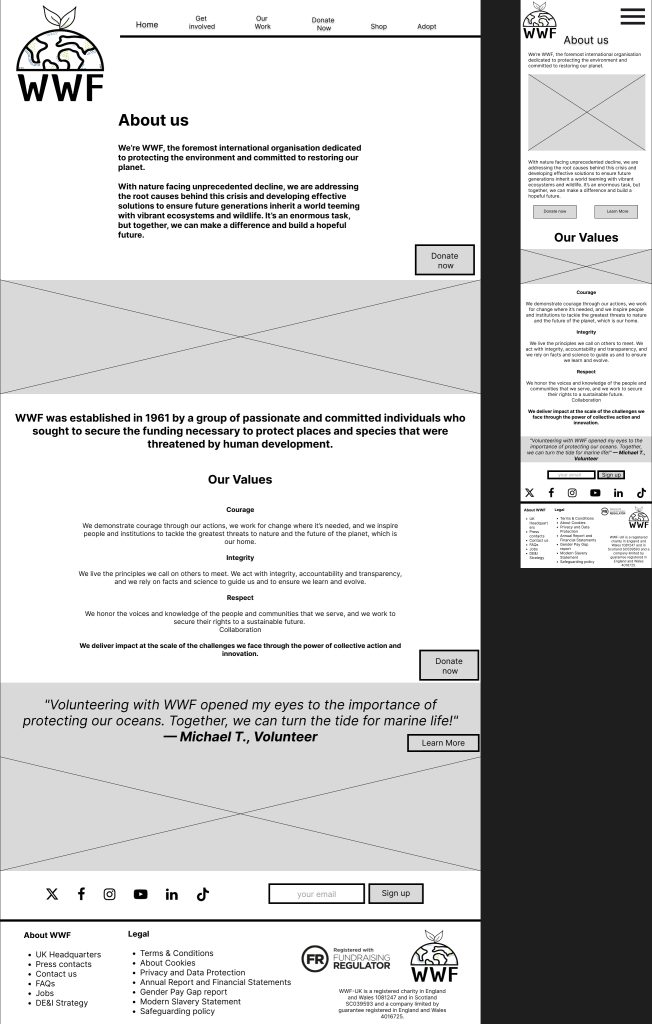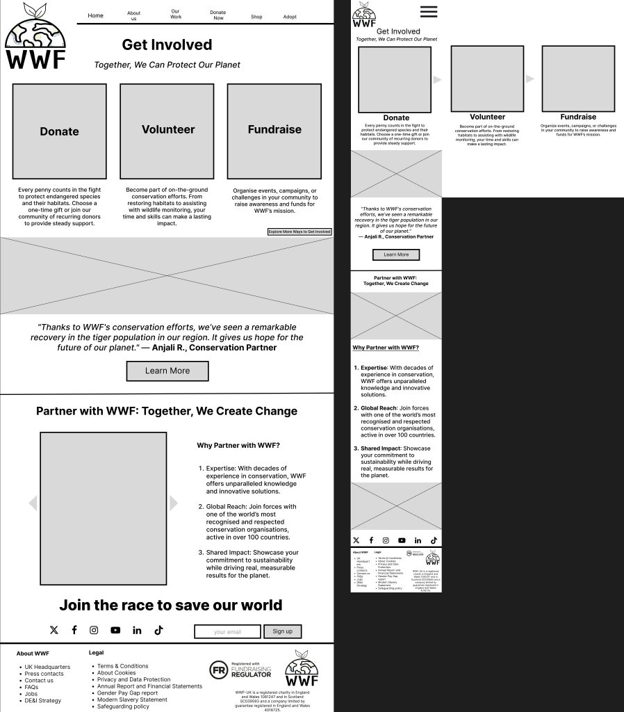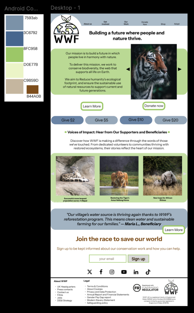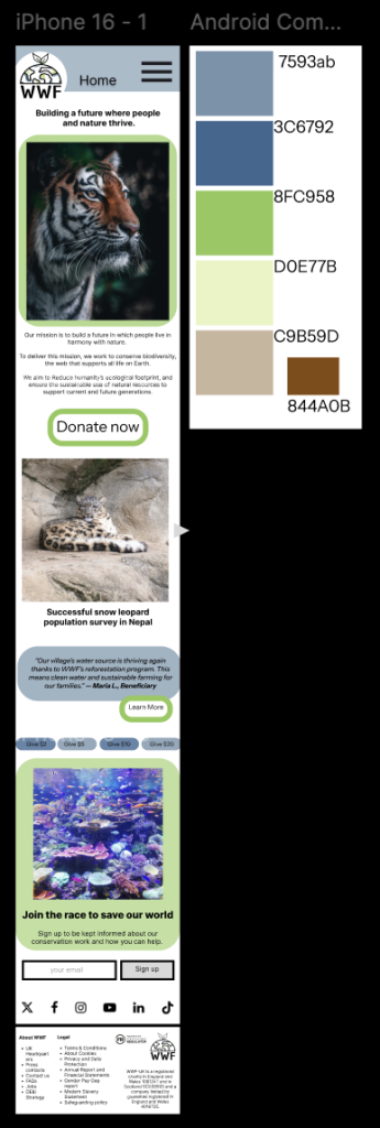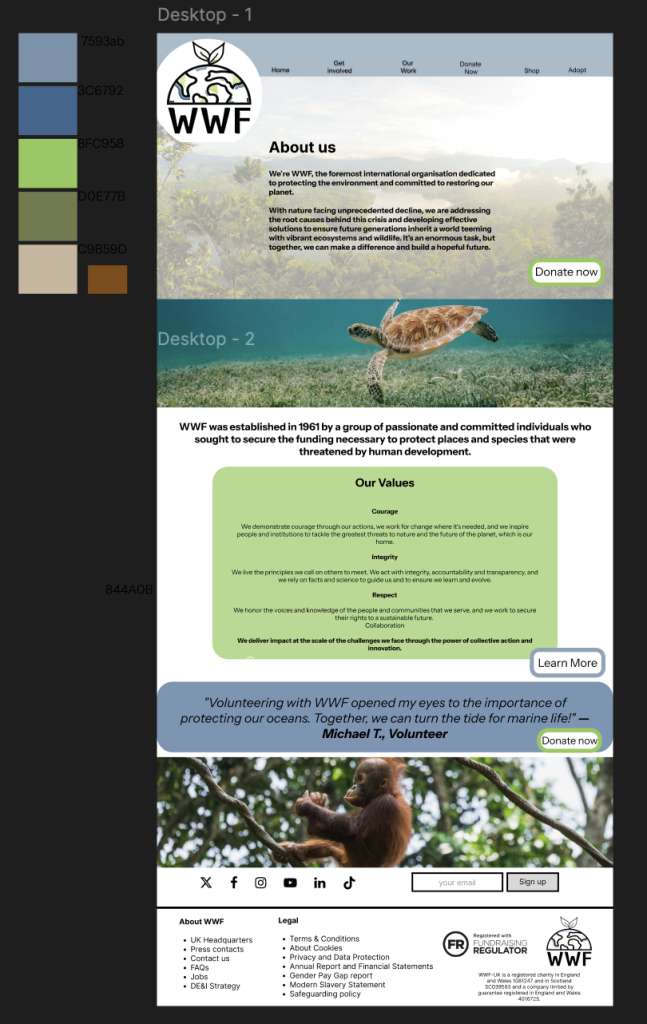 I am over all pleased with the mid fid, homepage wire frames and I have tried to stay within the constraints of key graphic design principles, such as visual hierarchy. By using a large headline “Building a future where people and nature thrive” establishes a clear focal point and communicates the intentions of the WWF immediately. I also considered how CTA Buttons like “Learn More” and “Donate Now” are visually distinct, guiding users’ attention towards them, as they are important.