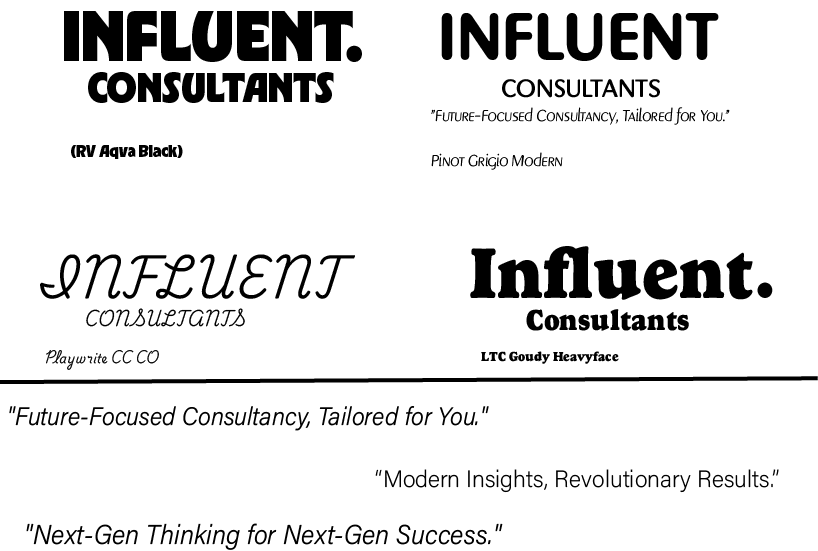 Logo 3) The Wild Card, This logo does not follow traditional rules of visual Hierarchy, and is not contained within an obvious space. This makes the logo intriguing, and out of the ordinary. It still succeeds clear legibility and the anti – classic way it is laid out feel exciting. This would be a great logo if you where looking to make s statement and step outside the normal confinement of a consultancy logo.