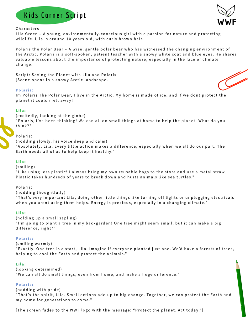 As part of my Branding I created the idea of Kids Corner – This could be a section of the website that contains games, quizzes and other Child Friendly options. One of these options being an animated video about climate change and how to help stop it. Below I have outlined the characters in my animation and the script I wrote.