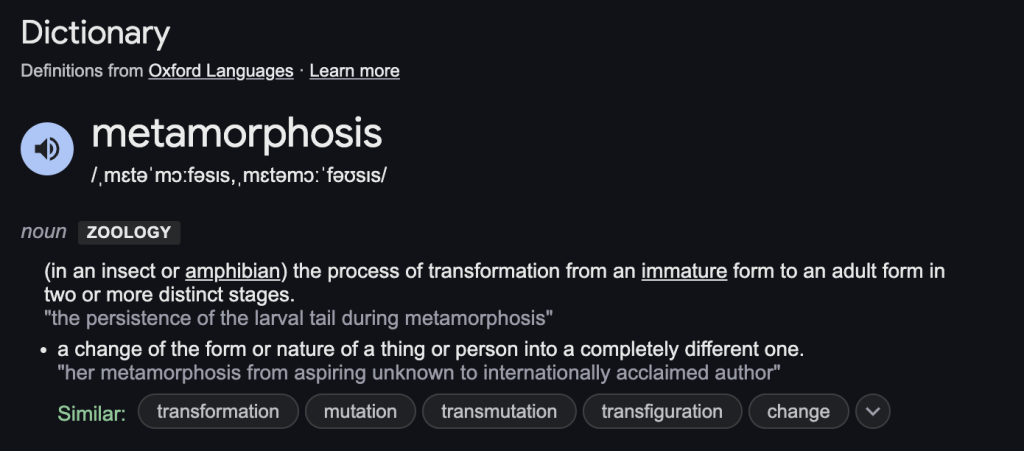 Outside of Animation Metamorphosis is defined as a physical change from one starting point – to a completely different end point. However within animation and art it can be used more loosely.