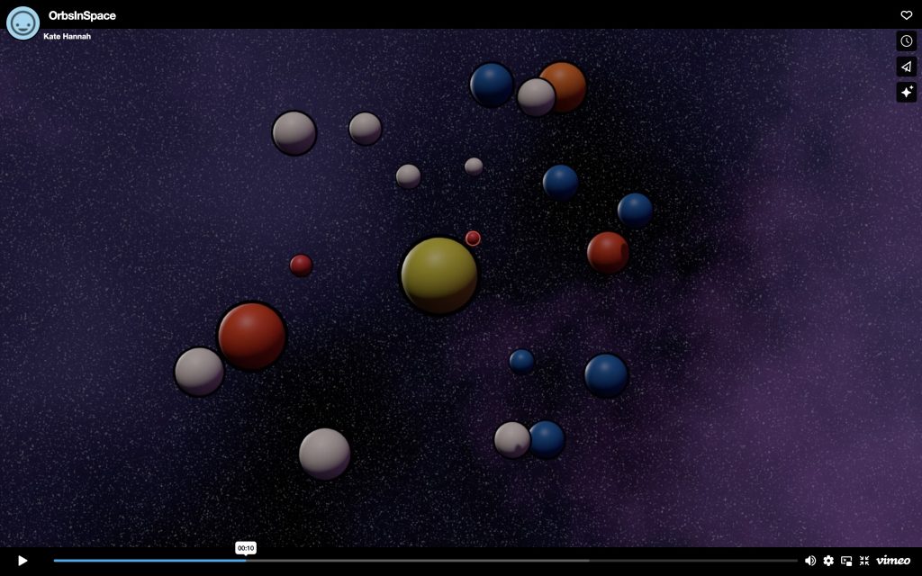 In the above screenshots, you can see how each planet can still be followed from 4 to 10 seconds. This means viewers can track a single planet’s journey while also seeing how they all move together as part of the bigger animation. I carefully designed their movement, timing, and interactions so they feel connected rather than random. Making sure the animation feels unified while each planet still follows its own path.