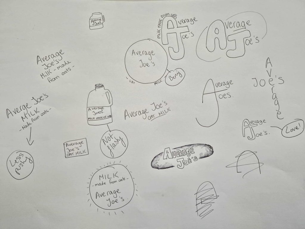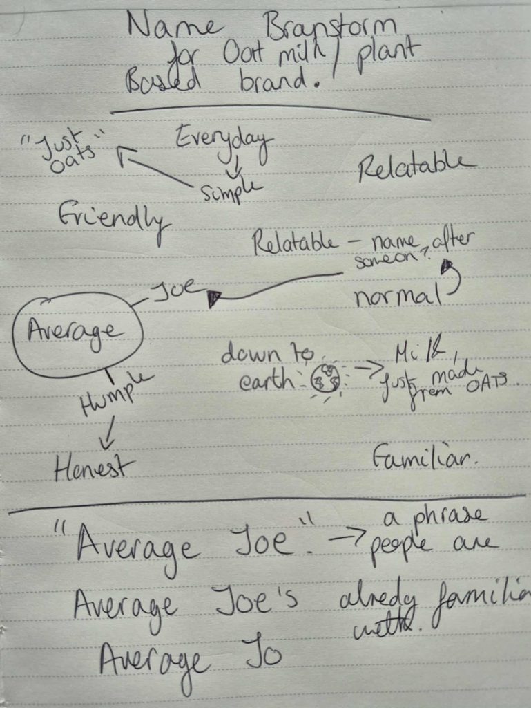 This section documents the development of my personal project. “Average Joe” including research, ideation, and creative exploration. My goal was to create a brand identity for an oat milk company that feels approachable and relatable, positioning plant-based milk as an everyday choice rather than a niche product. Throughout this process, I explored audience perceptions of plant-based alternatives, did word associations and naming brainstorms, and developed mood boards to define the brand’s tone and personality. Each stage of this development helped refine my concept and ensured that the final outcome aligns with my aims of creating a grounded, inclusive, and human-centred brand.