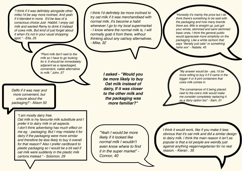 Next I wanted to do some research on my Idea that if plant Milk was placed closer to normal milk in supermarkets, and carried the same asthetics would people be more likely to try it? I asked a variation of people who already consume plant milk, and people who don’t. Also some people who live in households where both is purchased.