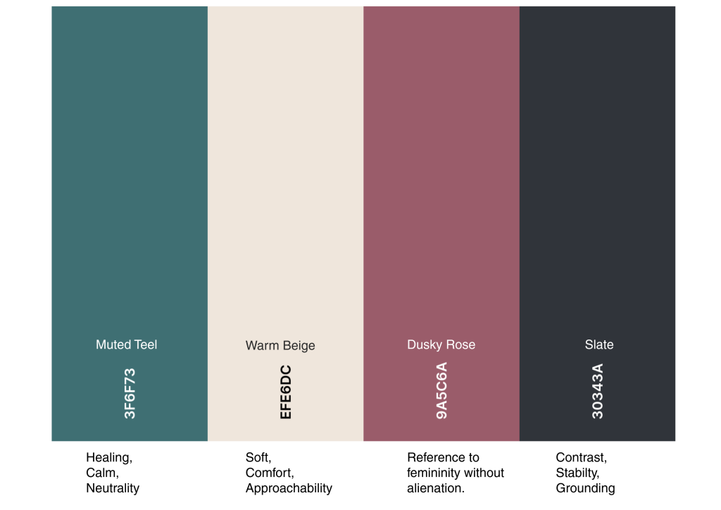 Natural colours provide visual balance and clarity, supporting accessibility while avoiding traditionally gendered colour associations. My palette should create a sense of shared understanding that is not tied to gender or cultural stigma.