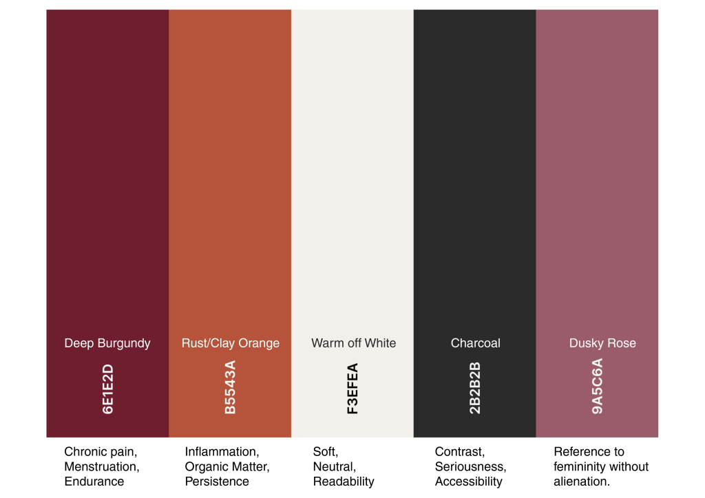 In developing the visual identity for the poster and AR trigger, I am carefully considering the cultural and ethical implications of colour use in relation to female and non/reproductive health. Rather than relying on traditionally gendered colour associations such as pink, I am exploring deeper, more grounded tones that communicate seriousness, strength, and chronic impact.