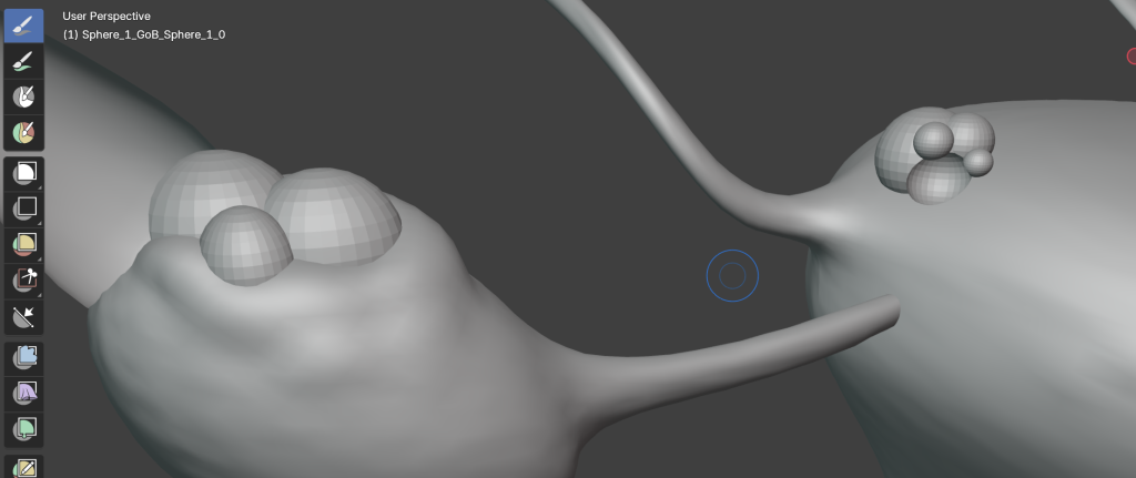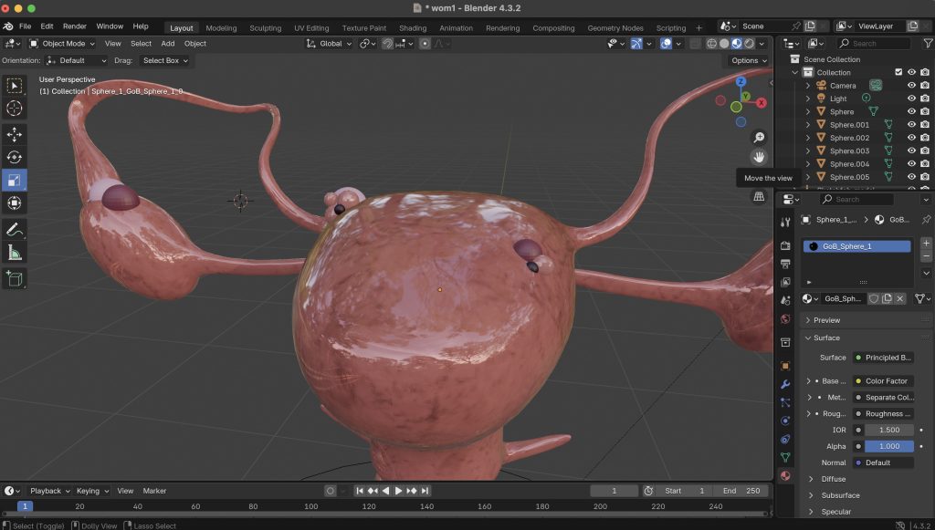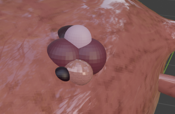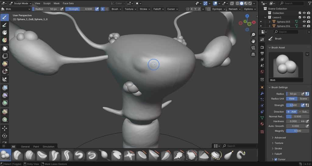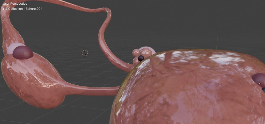 I used Blender’s sculpting tools, including the blob brush, to slightly distort the uterus surface and create the effect of inflammation around the lesions. This helped the tissue feel more organic and realistic, rather than looking like separate shapes placed on top of the model.