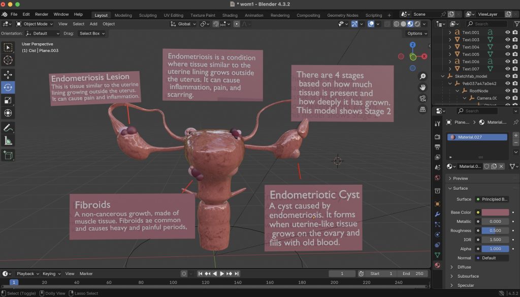To begin creating my 3D model in Blender, I used a free, CC attributed uterus model that I could later adapt by adding endometriosis lesions and adhesions. Starting with a licensed model gave me an anatomically accurate base while still allowing flexibility for modification. I imported the model in glTF format, which preserved scale, materials, and geometry, making it suitable for editing in Blender and for later export into platforms such as 8th Wall for WebAR deployment.